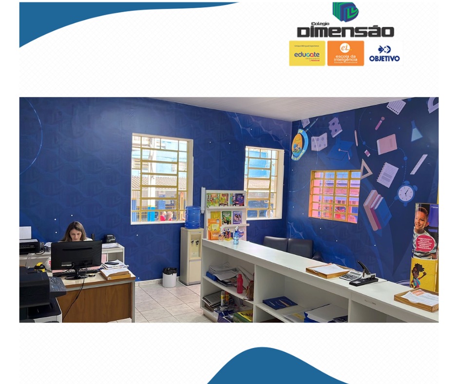 MAIS COR E MAIS VIDA NO DIMENSÃOOlha que linda a nossa secretaria com a parede toda adesivada, combinando com o ambiente escolar. E não vamos parar por aí.
